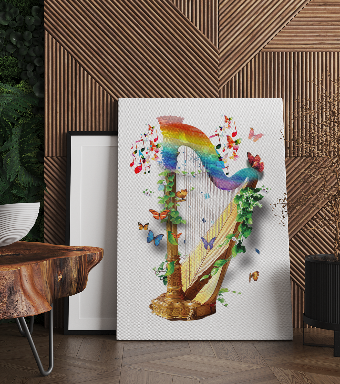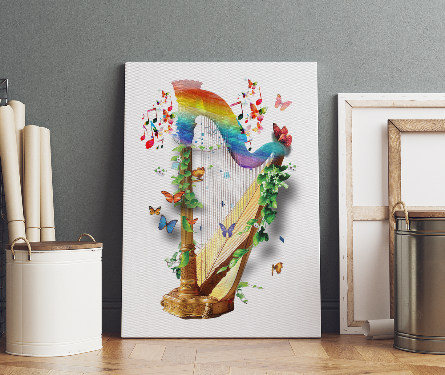 Brown Harp Musical Instrument Beautiful Butterfly And Flower Canvas Prints