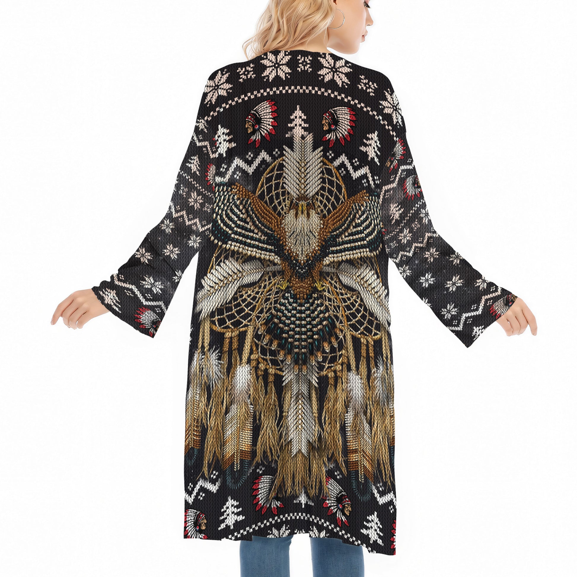 Designed in a deep dark tone blended with earthy and golden accents, this cardigan features a powerful graphic of an eagle soaring through a dreamcatcher, detailed feathers, and a subtle tribal chief motif. The intricate tribal-inspired patterns flow seamlessly across the entire cardigan, making it a unique piece that symbolizes strength, protection, and freedom.