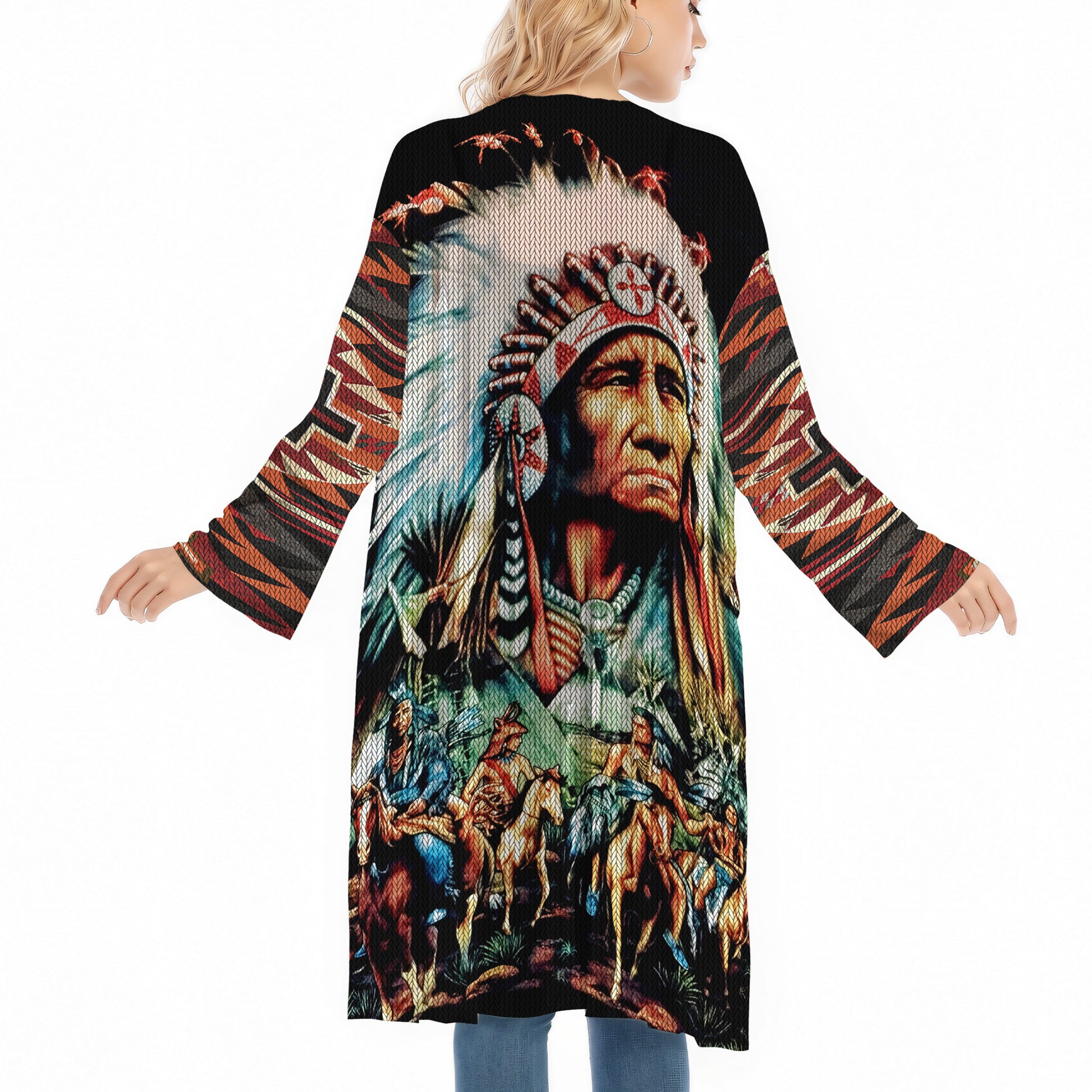 Native American Indian Chief Warrior with Tribal Horsemen Ugly Cardigan, American Native Gifts, Indian Chief Cardigan