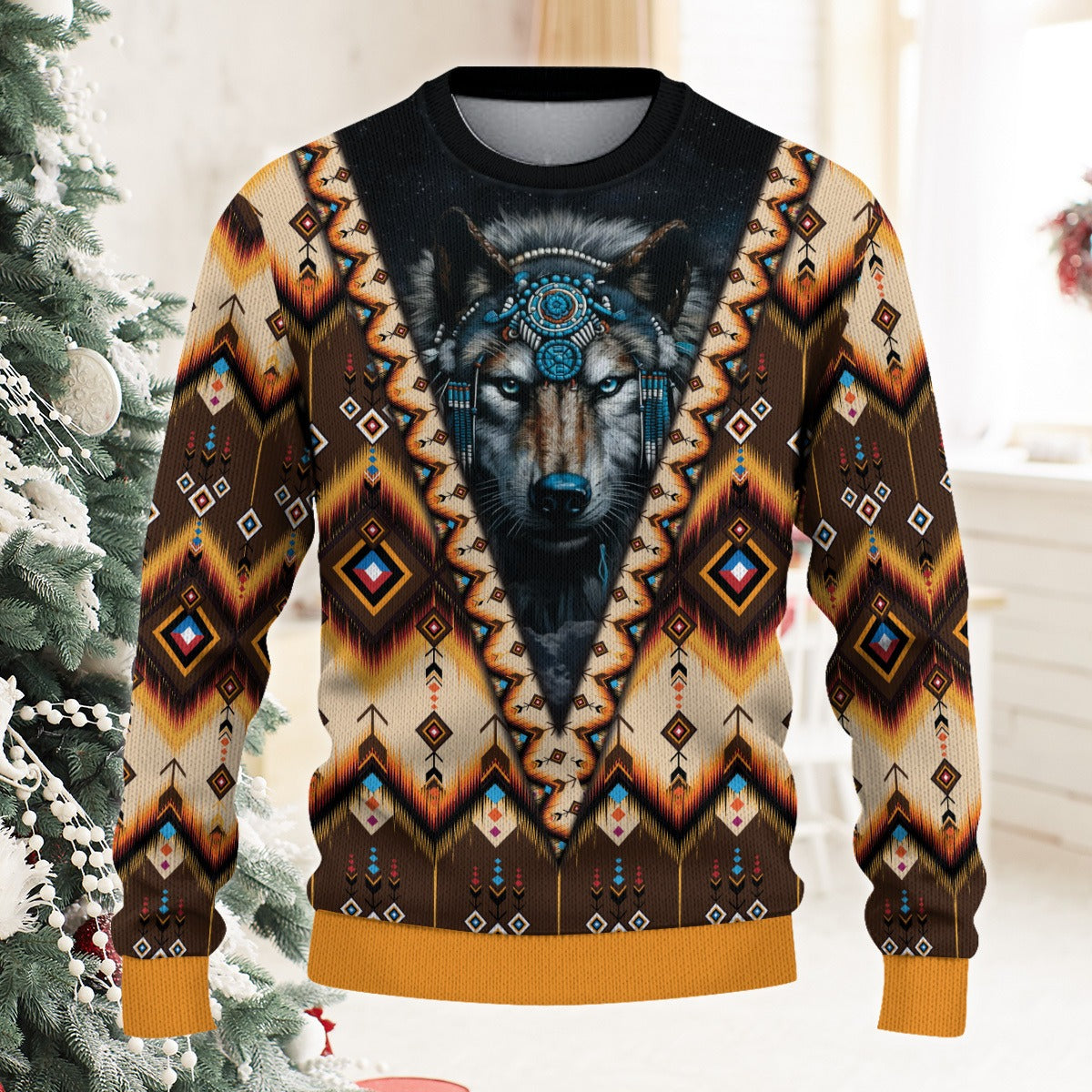 Native American Wolf With A Native Headdress Ugly Sweatshirt,Ugly Christmas Sweater With Wolf Design, Native American Wolf Sweatshirt, Wolf Headdress Christmas Sweatshirt, Wolf Spirit Christmas Sweatshirt, Wolf Spirit Christmas Sweatshirt