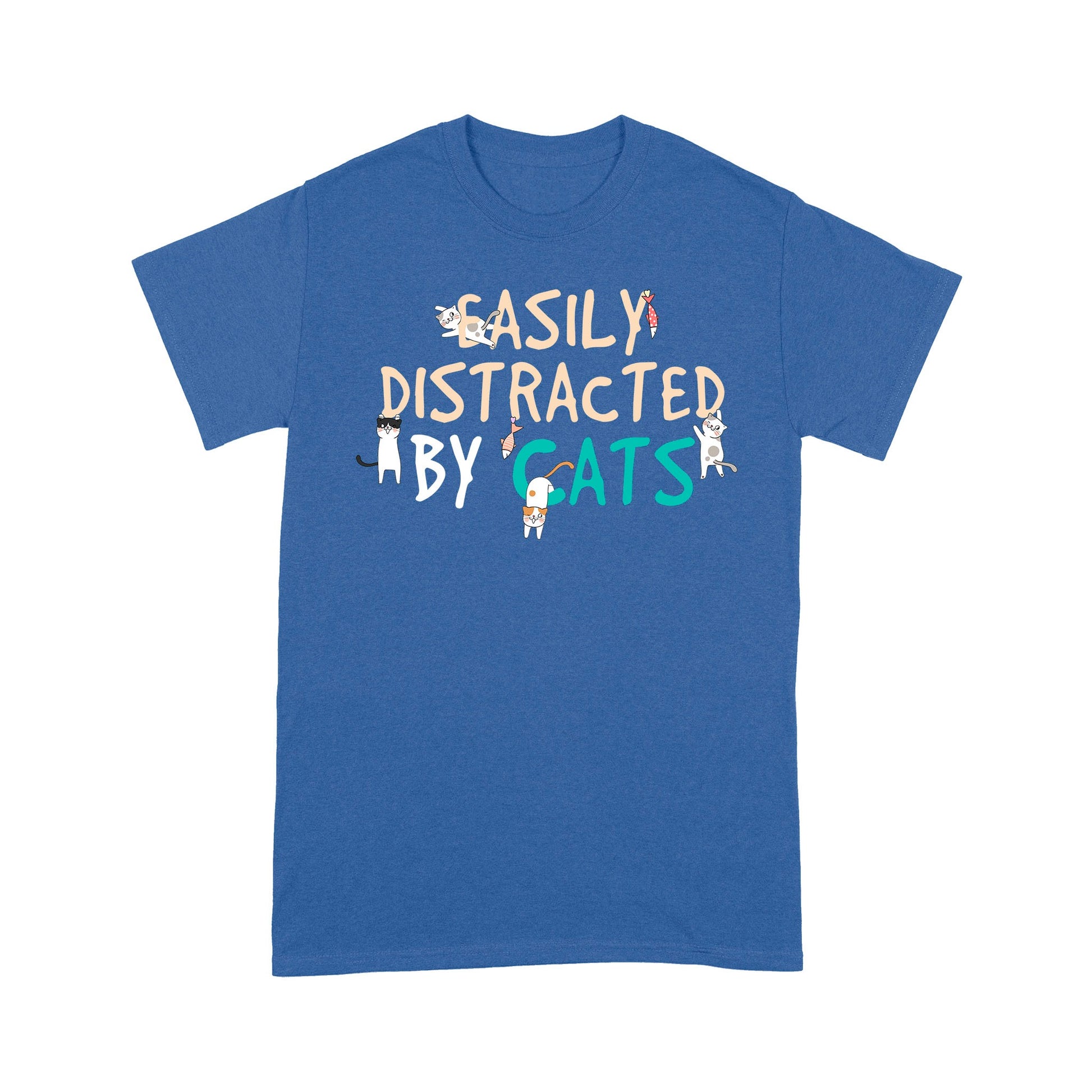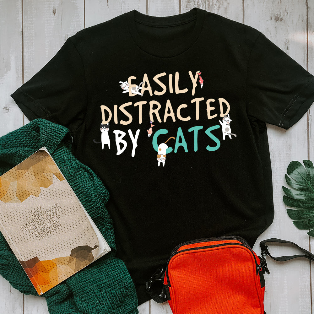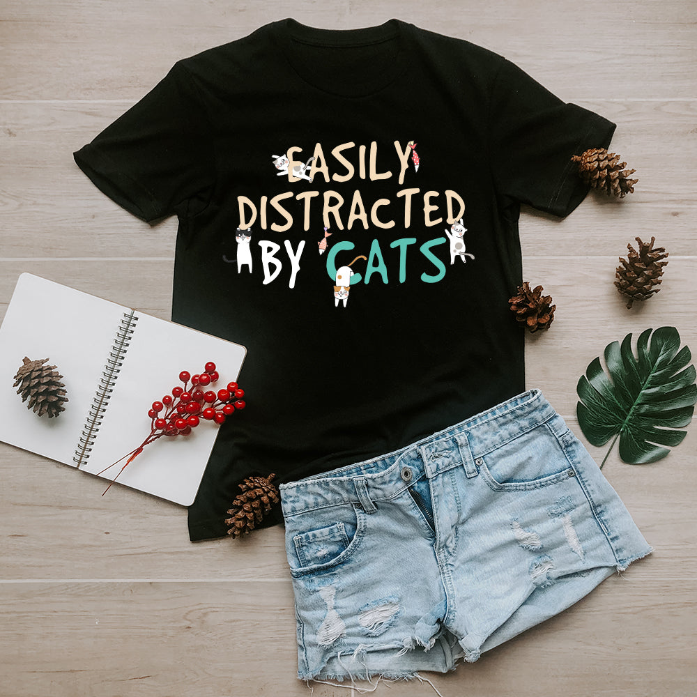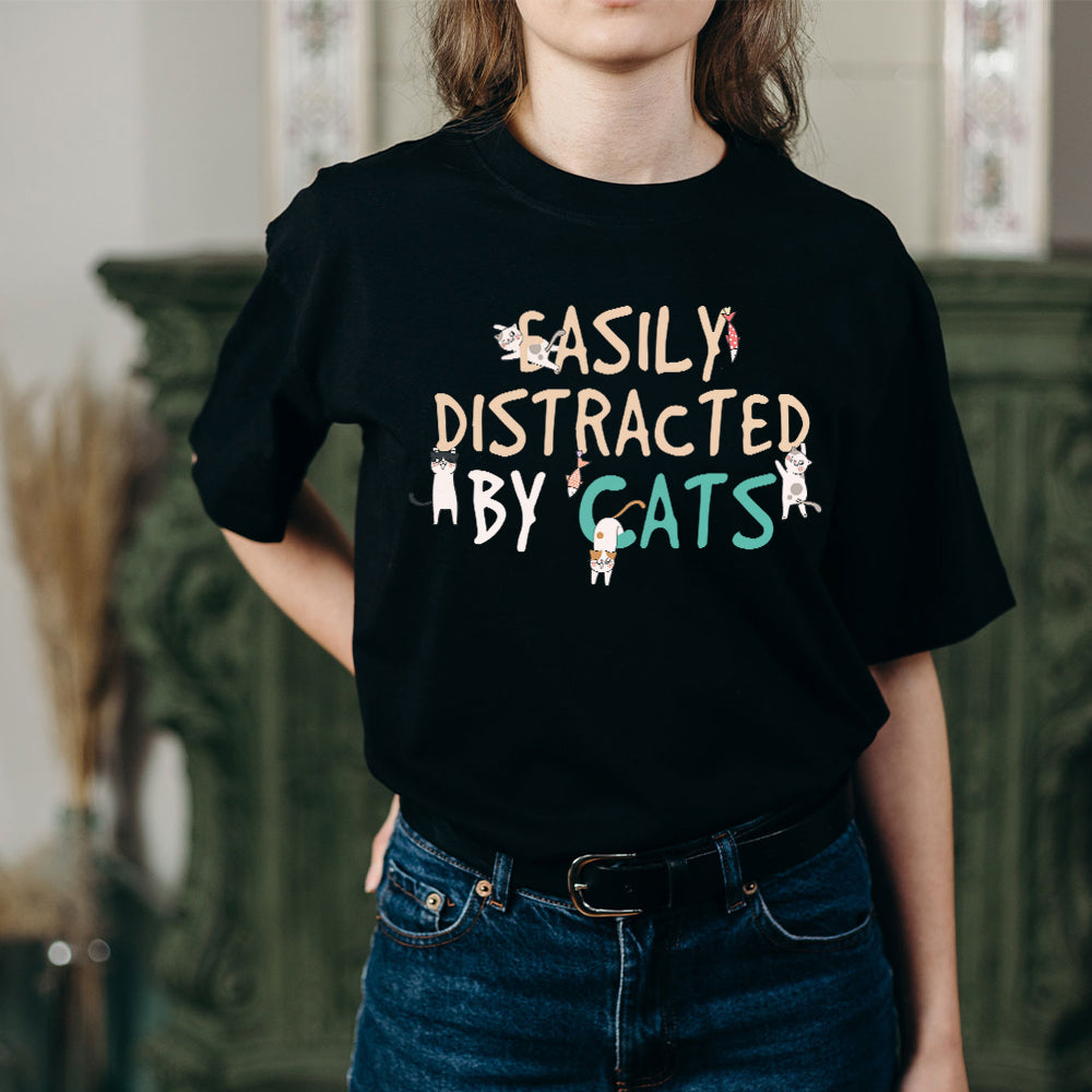 This "Easily Distracted By Cats" t-shirt is perfect for all the cat lovers out there who know the struggle of trying to stay focused while a mischievous feline is around. The shirt features a playful design with multiple naughty cats scattered throughout, guaranteed to bring a smile to any cat owner's face. The high-quality material ensures that the shirt is comfortable to wear all day long. Whether you're out and about or lounging at home, this t-shirt is sure to make a statement and share your love for cats with the world.