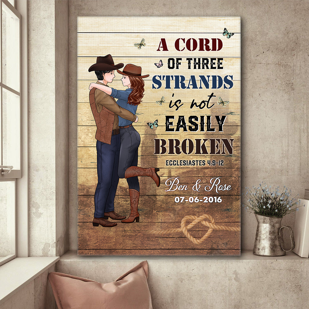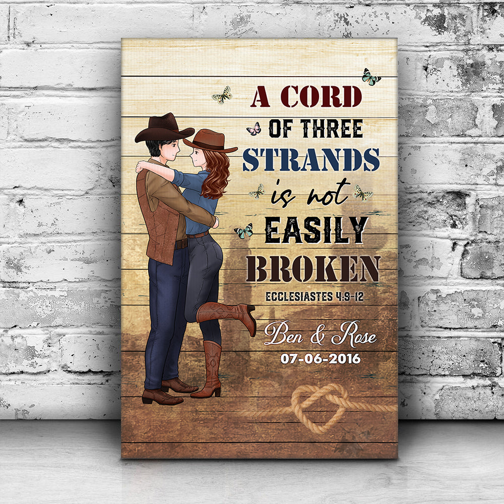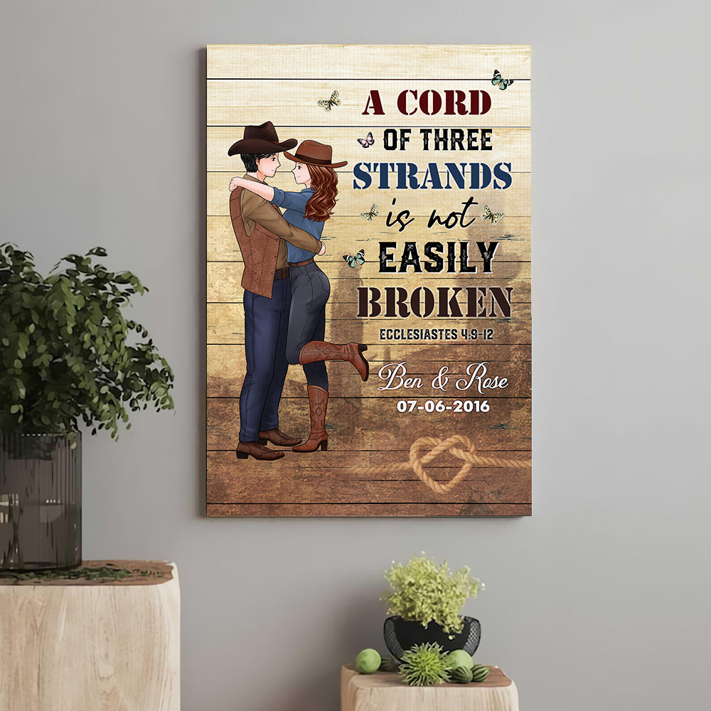 The canvas print features a romantic depiction of a cowboy and cowgirl. The design incorporates the biblical quote "A Cord of Three Strands Is Not Easily Broken" from Ecclesiastes 4:9-12, emphasizing the strength and resilience that comes from unity and teamwork.