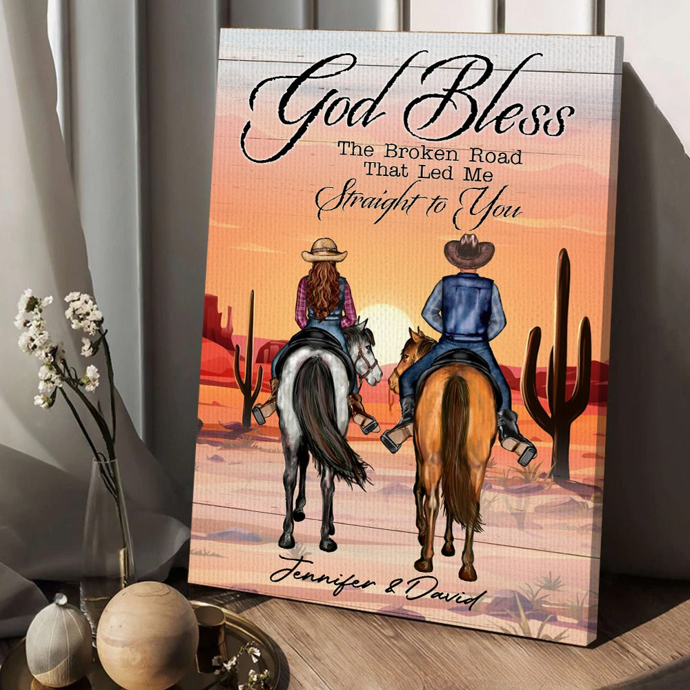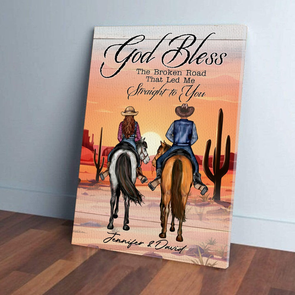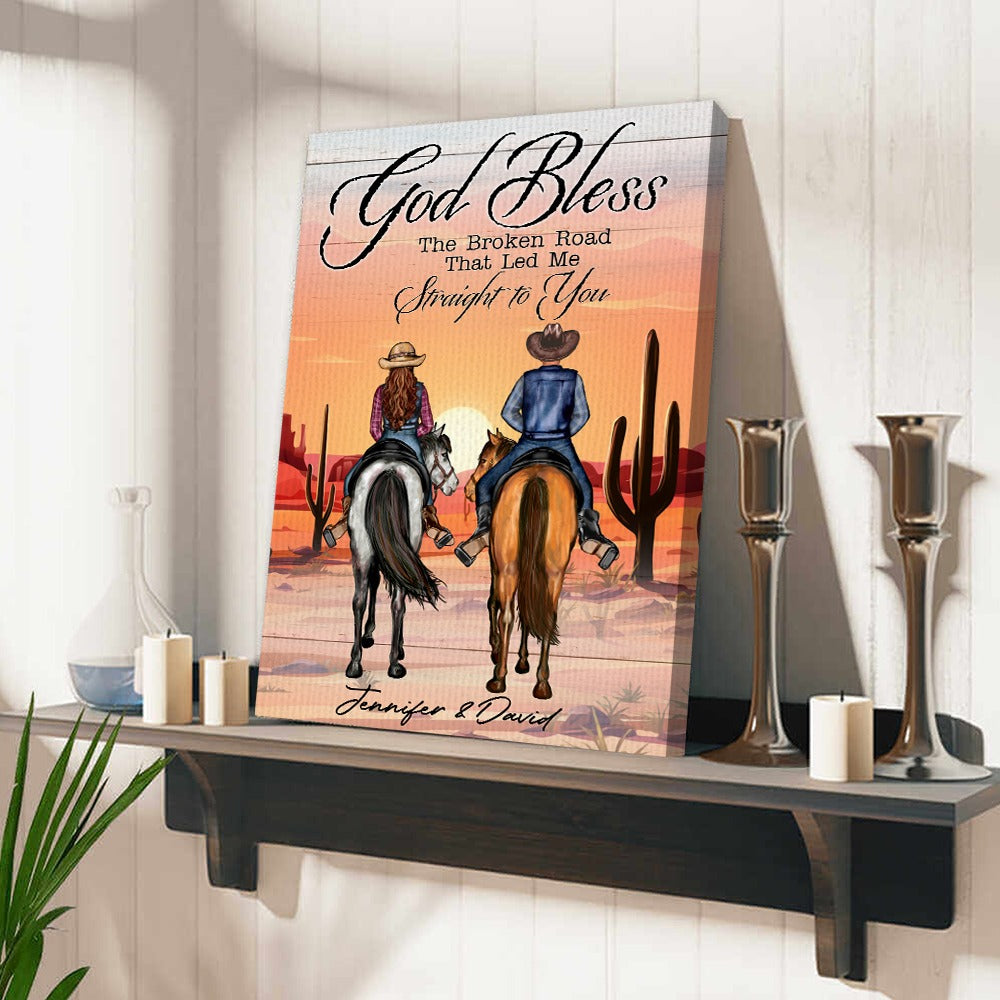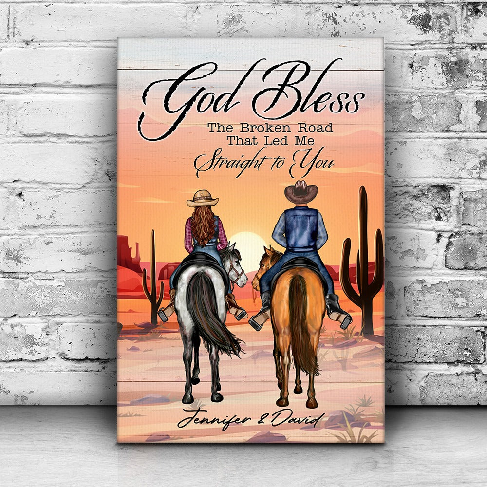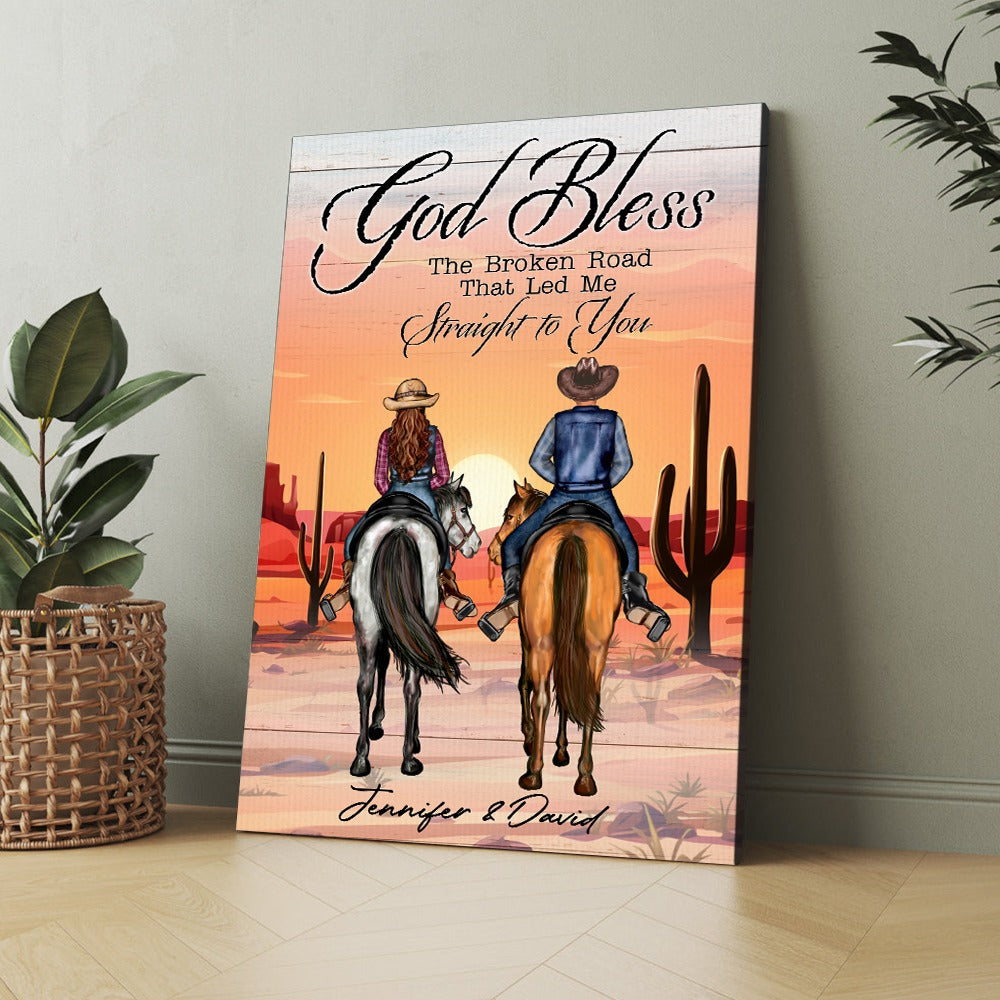 This personalized canvas print features a cowboy couple and their horse, showcasing the message "God blessed the broken road that led me straight to you."