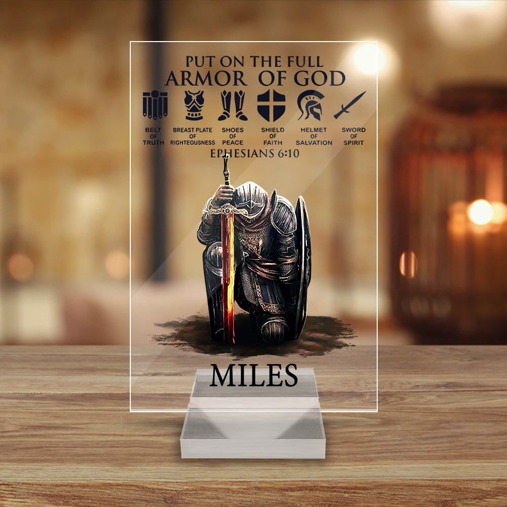 Honor your faith and inner strength with this Personalized Armor of God Acrylic Plaque, inspired by Ephesians 6:10. The powerful design features a fully armored warrior kneeling with a glowing sword and shield, symbolizing submission to God’s power and protection. Above the warrior is the verse “Put On The Full Armor of God”, along with visual representations of the six spiritual elements: Belt of Truth, Breastplate of Righteousness, Shoes of Peace, Shield of Faith, Helmet of Salvation, and Sword of the Spirit - a bold reminder of biblical strength.