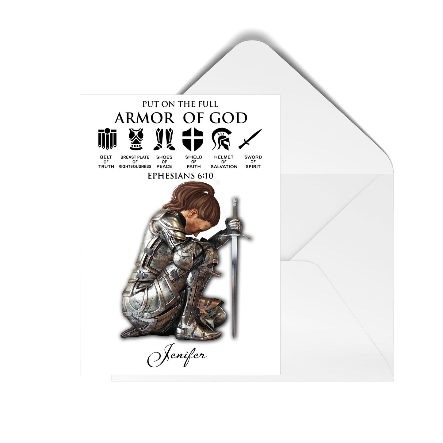 Share your faith and encouragement with our Armor of God Christian Postcard, a beautifully designed piece that carries a powerful biblical message. Featuring a kneeling woman warrior in full armor, this postcard highlights the scripture from Ephesians 6:10 and the symbolic elements of God’s protection: the belt of truth, breastplate of righteousness, shoes of peace, shield of faith, helmet of salvation, and sword of the Spirit. Perfect for sending uplifting words, displaying as inspirational decor, or gifting to loved ones, this postcard serves as a reminder to stay strong in faith and courage.
