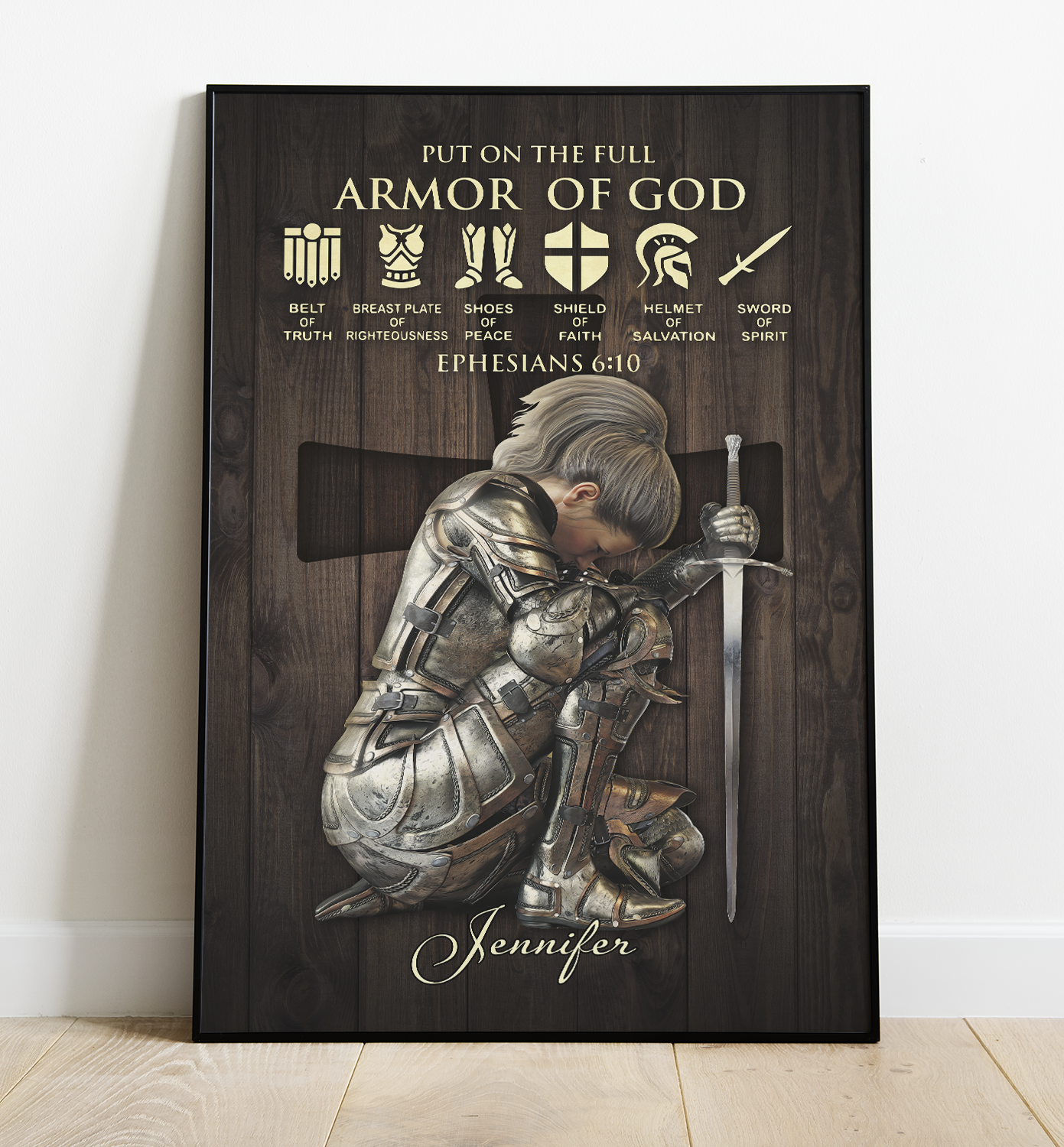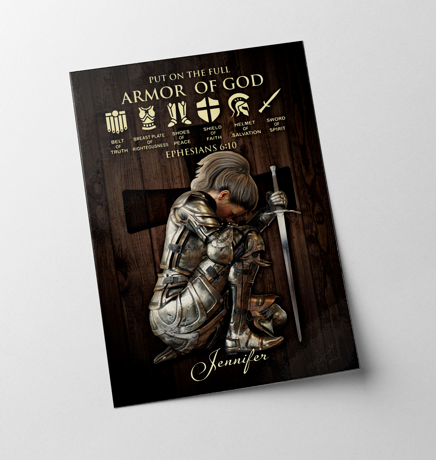 Add strength, faith, and inspiration to your home with this powerful "Armor of God" Poster, featuring a kneeling woman warrior in full armor, sword in hand and head bowed in prayer. Inspired by Ephesians 6:10, it highlights the six pieces of God’s armor – the Belt of Truth, Breastplate of Righteousness, Shoes of Peace, Shield of Faith, Helmet of Salvation, and Sword of the Spirit. Set against a rustic background with a subtle cross silhouette, this poster is a striking reminder of spiritual courage and divine protection.