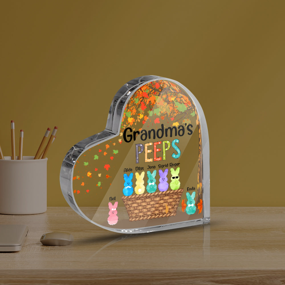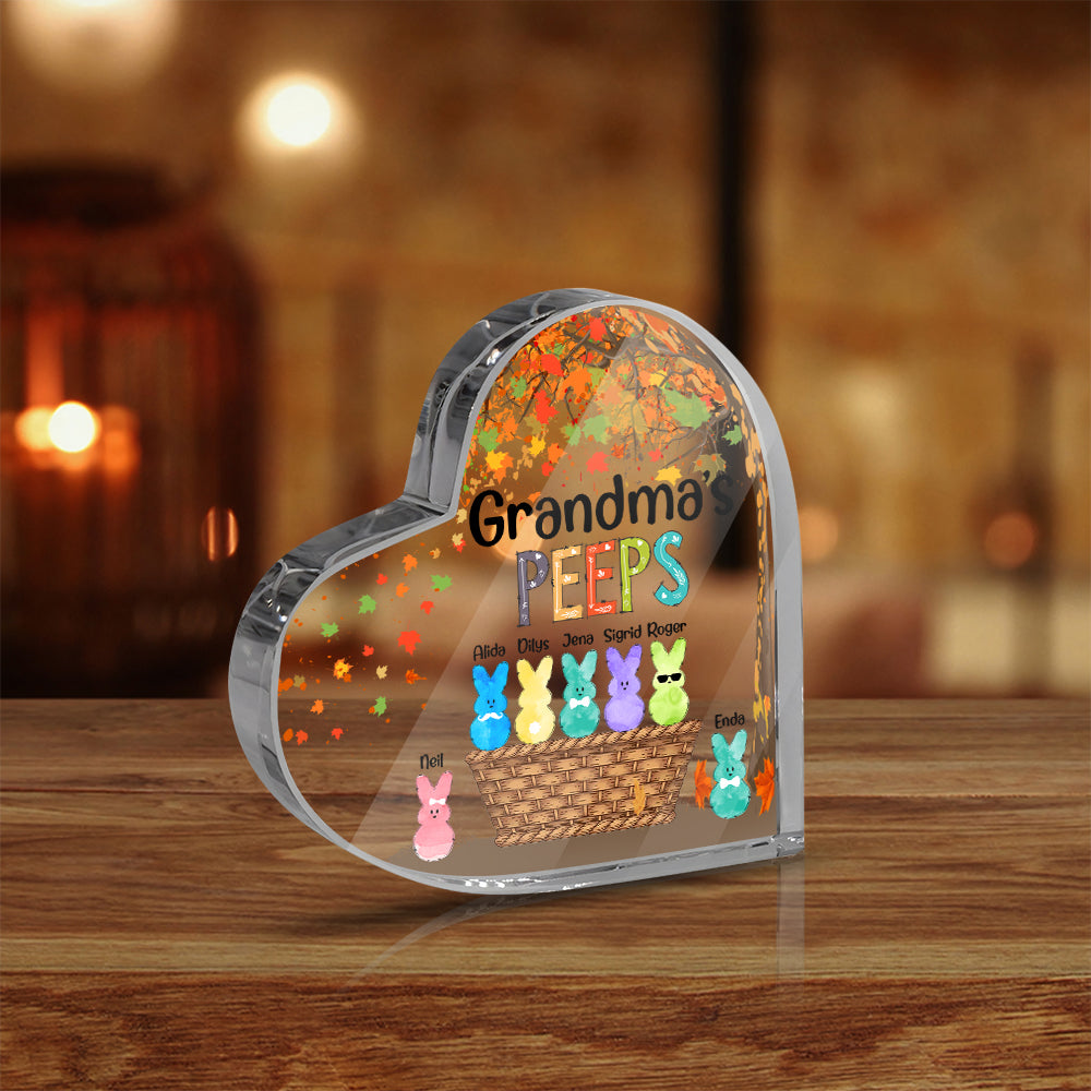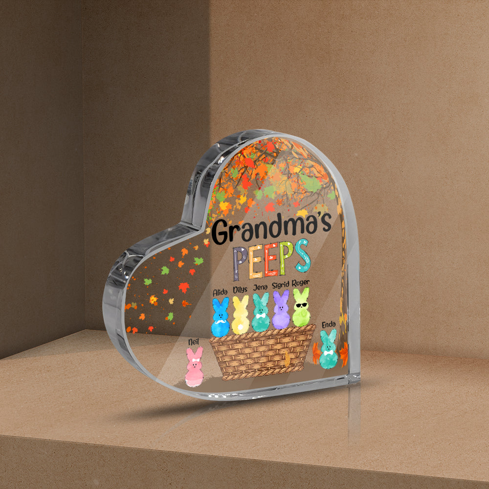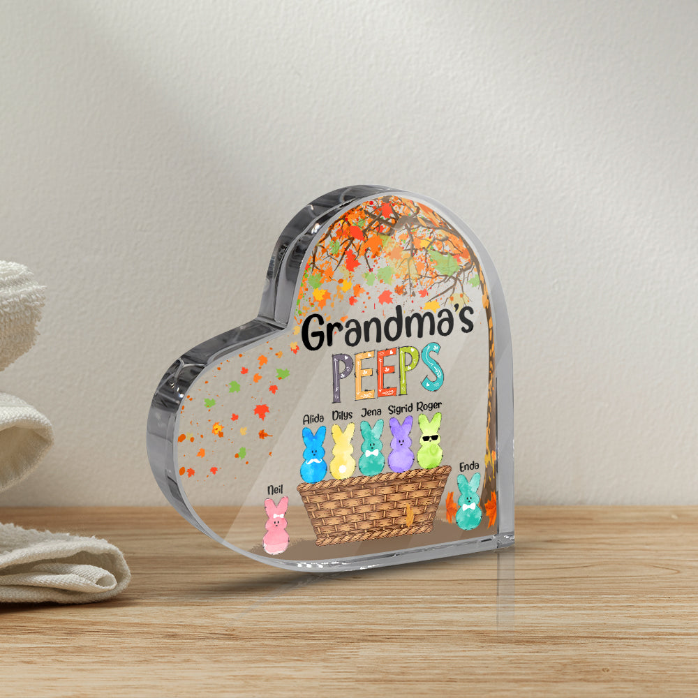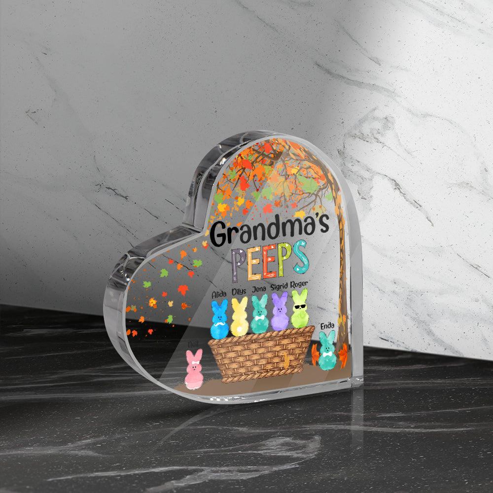 This custom acrylic plaque heart is the perfect gift to celebrate the special bond between a grandma and her grandkids, affectionately called "peeps". The beautiful design features a heart-shaped acrylic plaque with a charming and colorful peeps graphic, which can be personalized with grandma's name and the names of her beloved grandchildren. It's a touching and unique way to show your love and appreciation for the grandma in your life, sure to be treasured for years to come.