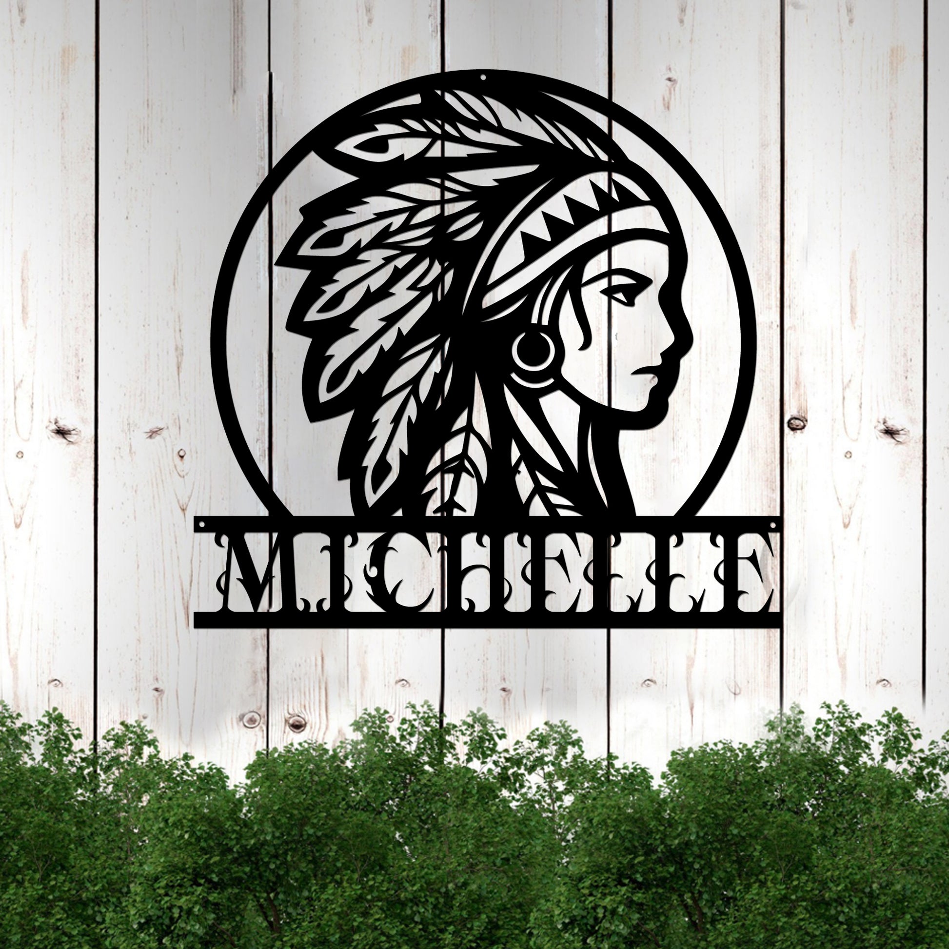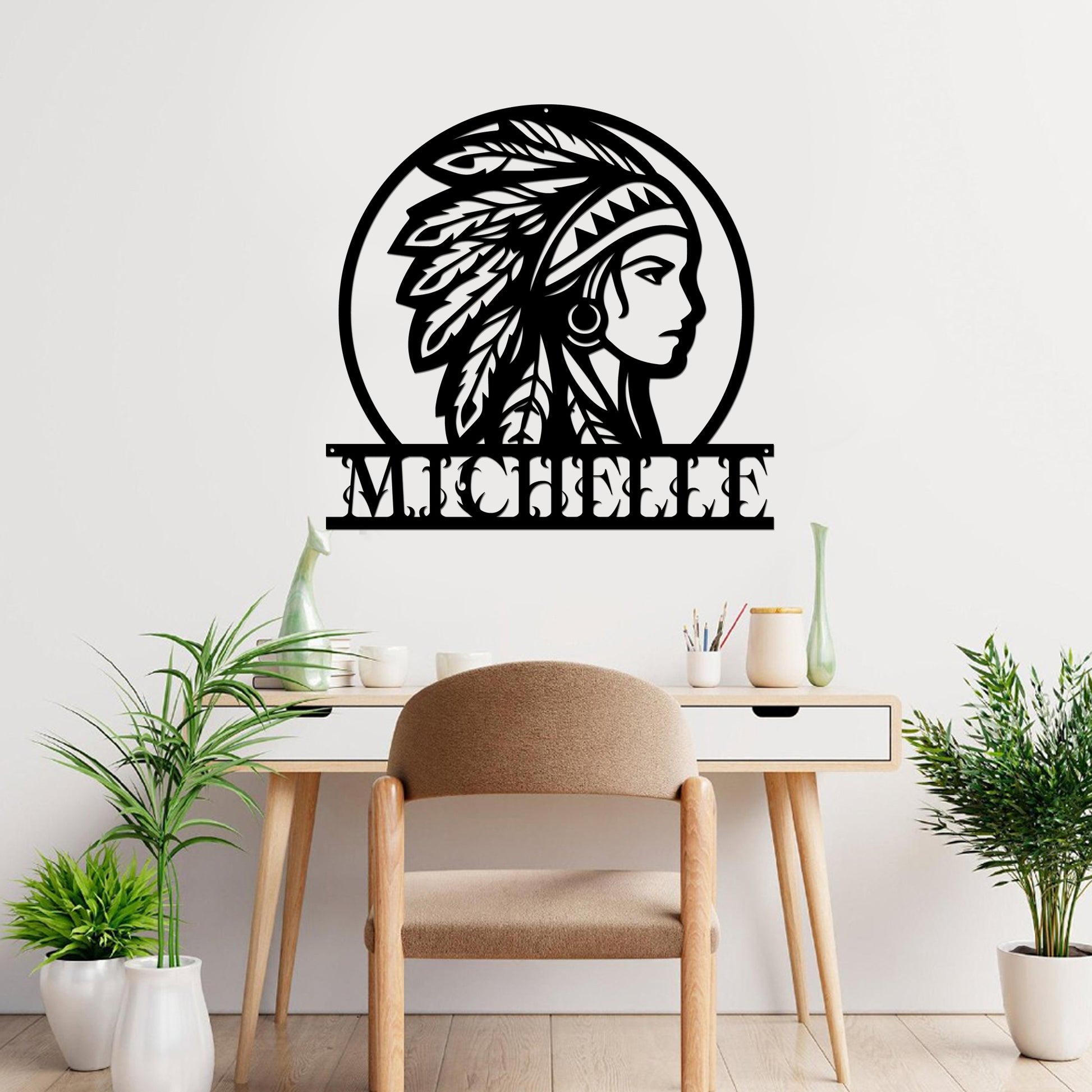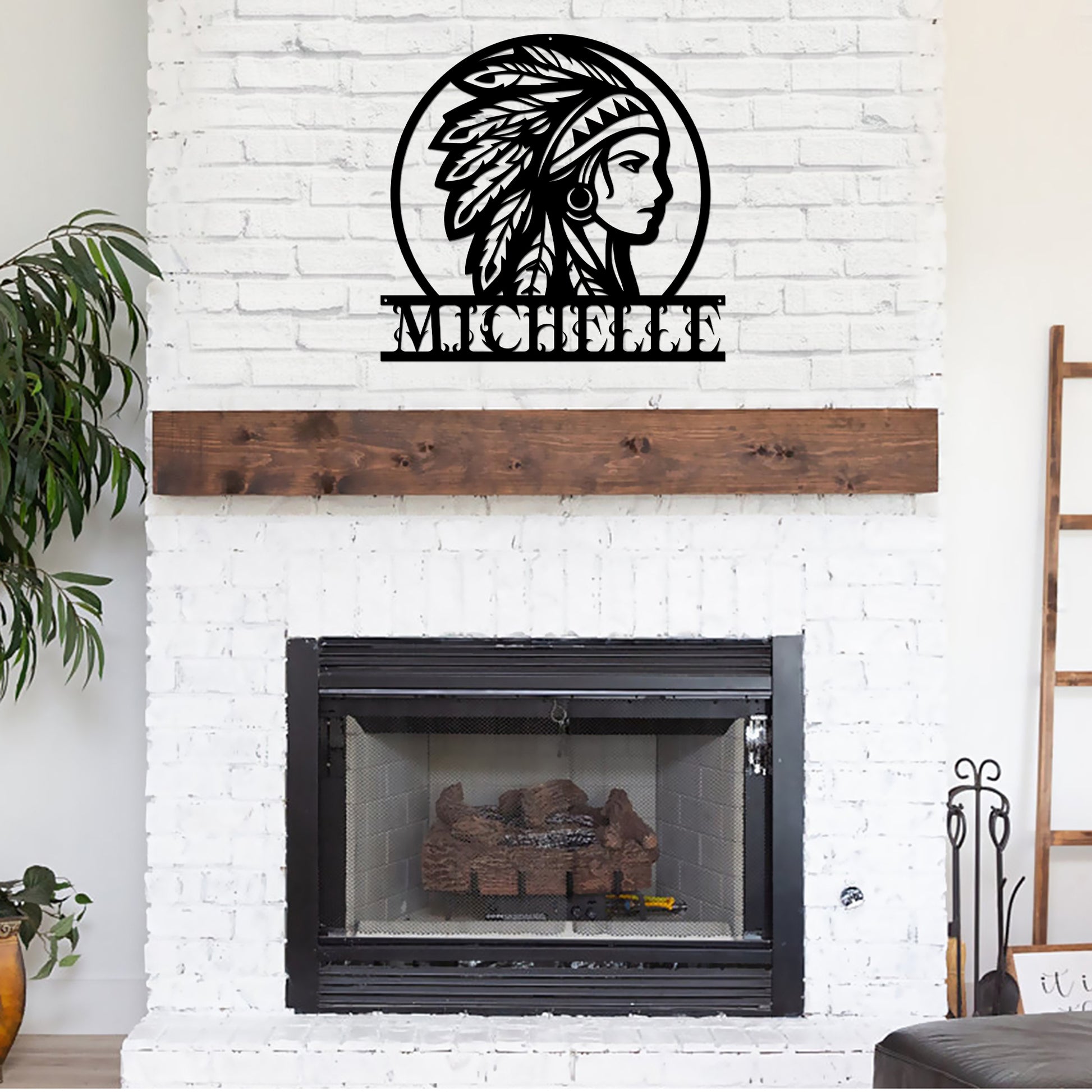 This Personalized Native American Headdress Metal Wall Art is a striking piece of décor that brings bold character and cultural elegance to any space. Expertly crafted from premium quality metal, the sign features an intricately detailed silhouette of a Native American profile wearing a majestic feather headdress, enclosed in a sleek circular frame. Below the design, your custom name is precisely cut in a bold, decorative font, making it a unique and personal statement piece for your home, office, or as a thoughtful gift. The durable powder-coated finish ensures it is resistant to rust and weathering, perfect for both indoor and outdoor display. With its clean black finish and precision detailing, this custom cut metal sign blends artistry and craftsmanship to create a lasting impression.