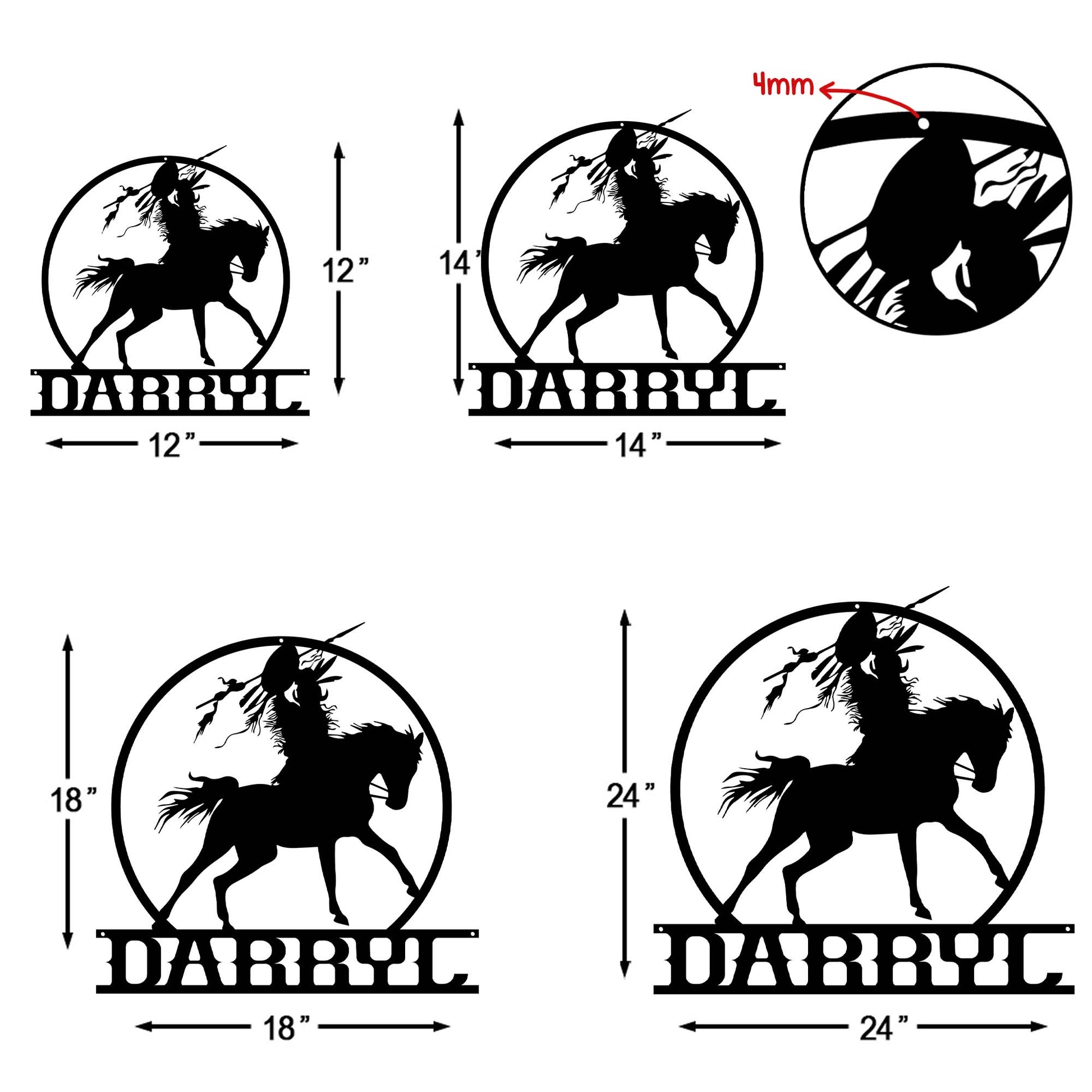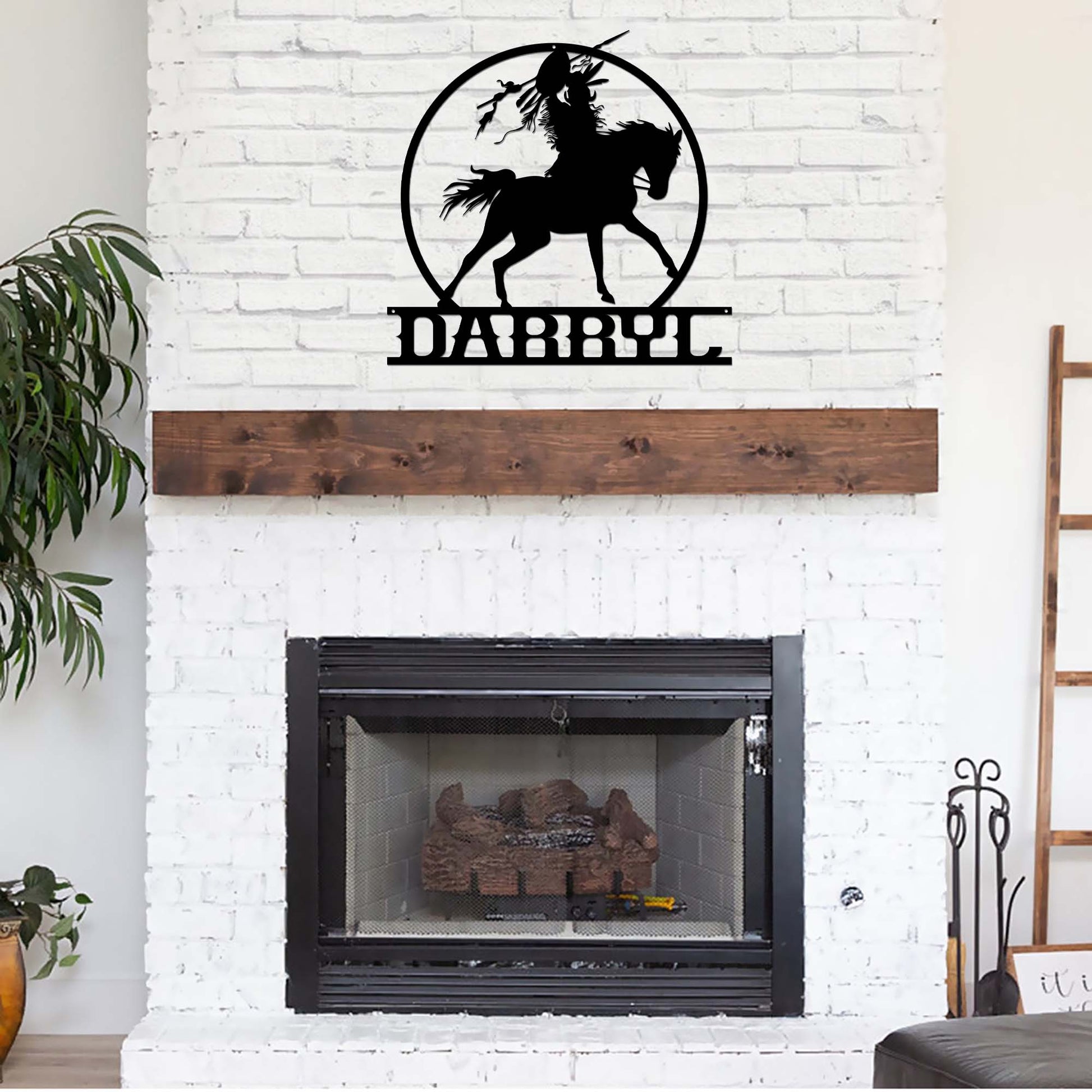 Bring a bold, cultural statement to your space with this Personalized Native American Warrior on Horse Cut Metal Sign. Expertly crafted from durable, high-quality metal, this striking piece features the silhouette of a warrior riding a horse within a circular frame, adorned with a customizable name plate at the bottom. Perfect as a unique gift or as eye-catching home décor, it captures the spirit of strength, heritage, and adventure. Each sign is precision cut for clean lines and a professional finish, making it suitable for indoor or outdoor display. Personalize the name section to make it truly your own, and add a distinctive touch to your living room, office, ranch, or cabin.