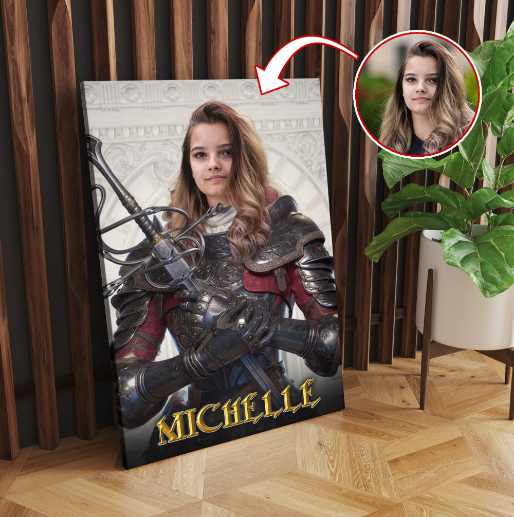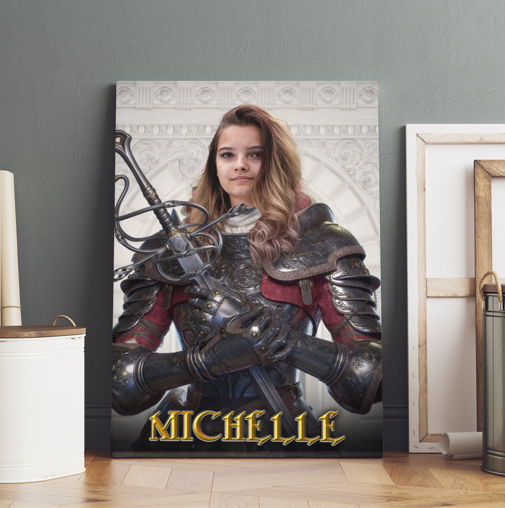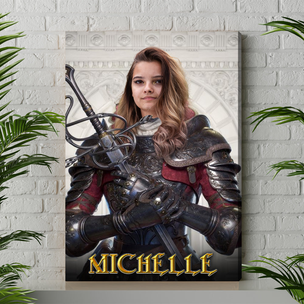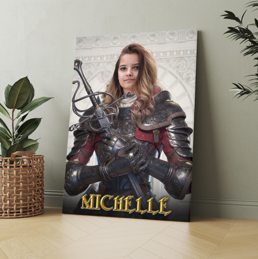 This personalized poster and canvas print features a stunning portrait of a strong female warrior, complete with armor and weapons. The design can be customized to include the name and image of the person you think of, making it a one-of-a-kind gift or adding to your own collection. Perfect for those who appreciate strong and inspiring femininity, this Warrior Portrait in Photo poster and canvas print is sure to impress.