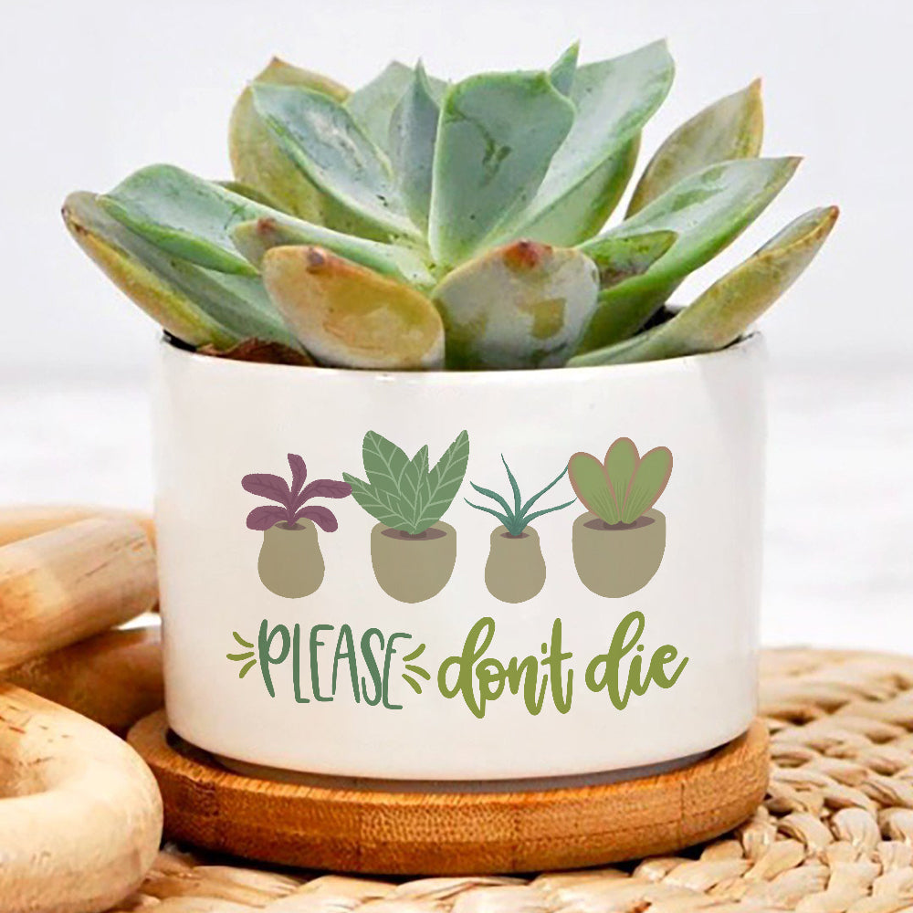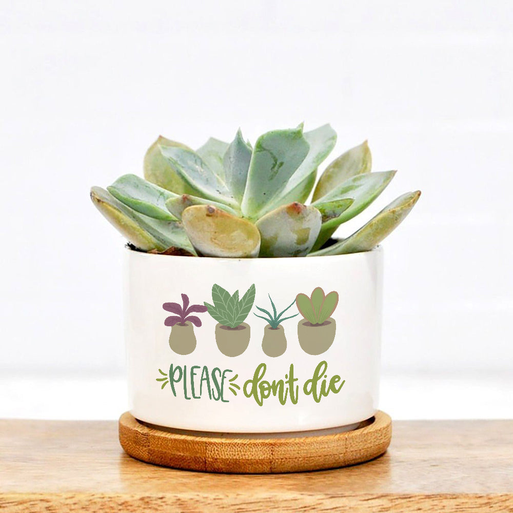 The "Please Don't Die" planter pots and trays are a charming and humorous addition to any plant lover's collection. Made from high-quality ceramic, this pot has a glossy white exterior with a playful font that says "Please don't die". The included tray is made from wood and is the perfect size to catch any excess water that might leak out of the pot. This design is not only functional but also serves as a gentle reminder to take care of your plants and give them the love and care they need to thrive. It's the perfect gift for any plant enthusiast or a great addition to your own home decor.